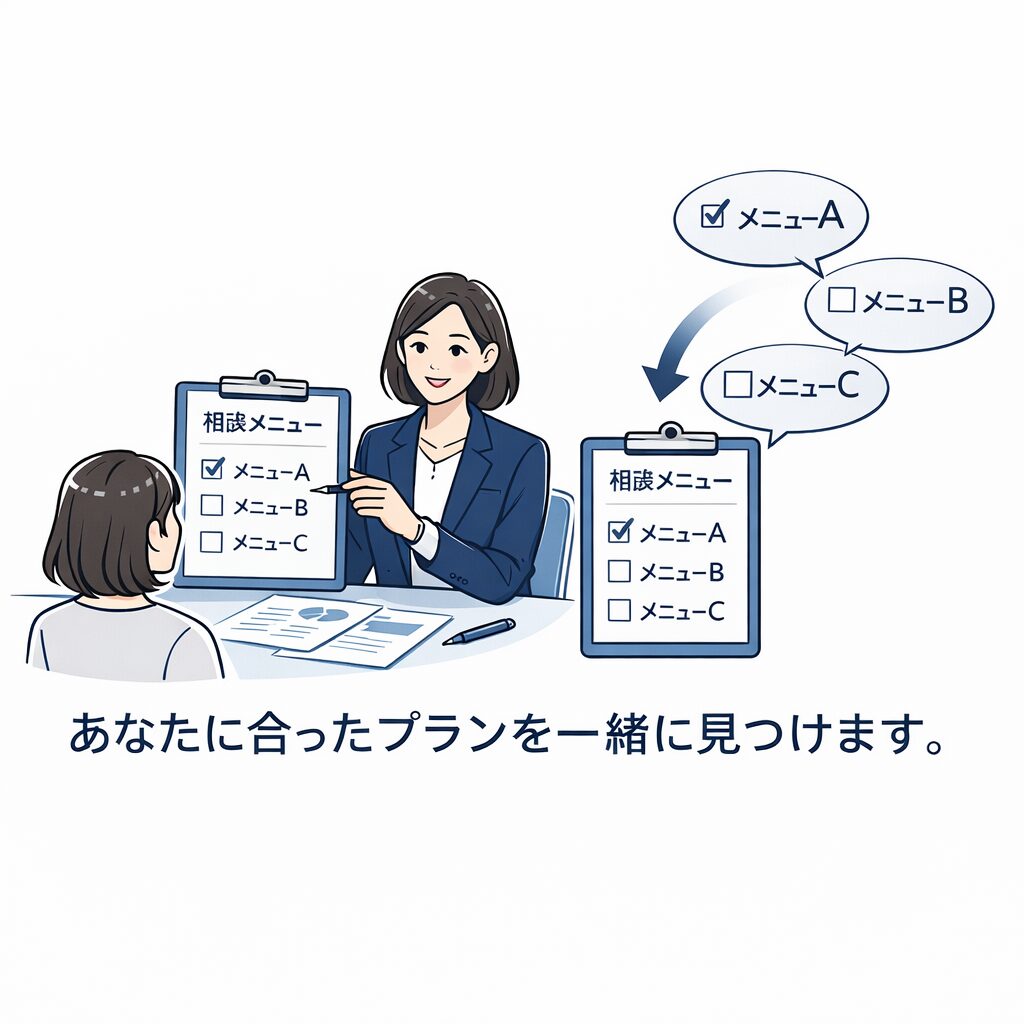 状況やご希望を伺ったうえで、最適な期間をご提案します。迷われる場合は、まずは短期間で全体像を整理する「2か月コース」をおすすめしています。実際に取り組んでみてから、6か月コース、年間コースへのステップアップをお選びいただけます。