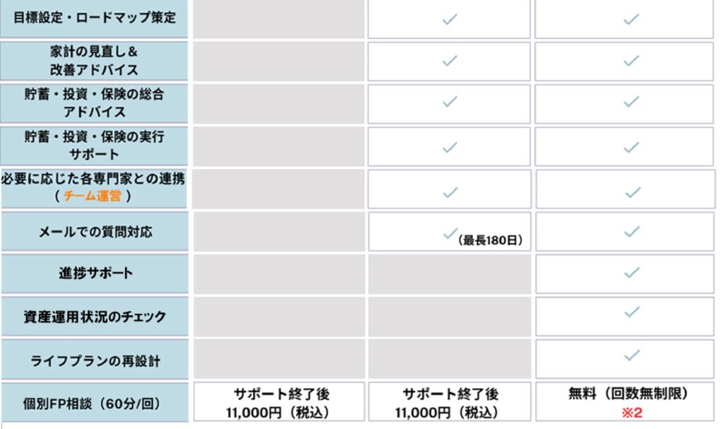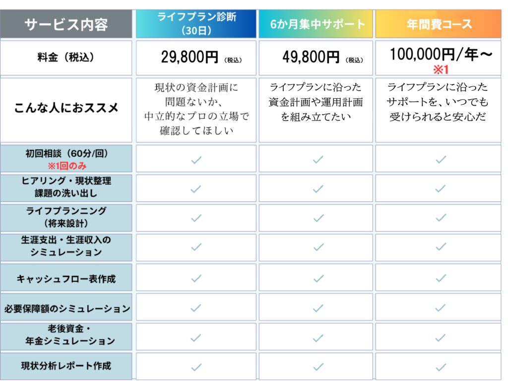 👉必要に応じた専門家との詳細はこちら ※1 前年所得の3%(次年度は2%) ※2 契約終了後は11,000円/回(税込) ※各サポートへの移行は差額分で対応します。 ※「個別FP相談」は有料サービスご利用者様限定となります ※サポート終了後のライフプラン再設計は「33,000円(税込)+個別FP相談料」のセットでお受けします